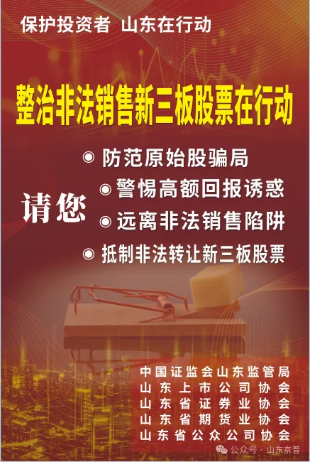 中國(guó)證監(jiān)會(huì)山東監(jiān)管局提醒您:防范原始股騙局;警惕高額回報(bào)誘惑;遠(yuǎn)離非法銷售陷阱;抵制非法轉(zhuǎn)讓新三板股票。2024年7月,山東億嘉農(nóng)業(yè)機(jī)械裝備股份有限公司(以下簡(jiǎn)稱“億嘉股份”)積極響應(yīng)中國(guó)證監(jiān)會(huì)山東監(jiān)管局防范非法證券投資期貨宣傳活動(dòng),開展了整治非法銷售新三板股票在行動(dòng)宣傳月活動(dòng)。目前非法證券活動(dòng)形式多、范圍廣,非法推薦股票期貨基金、股市黑嘴、場(chǎng)外配資、非法發(fā)行股票、非法代客理財(cái)、假冒證券公司等非法